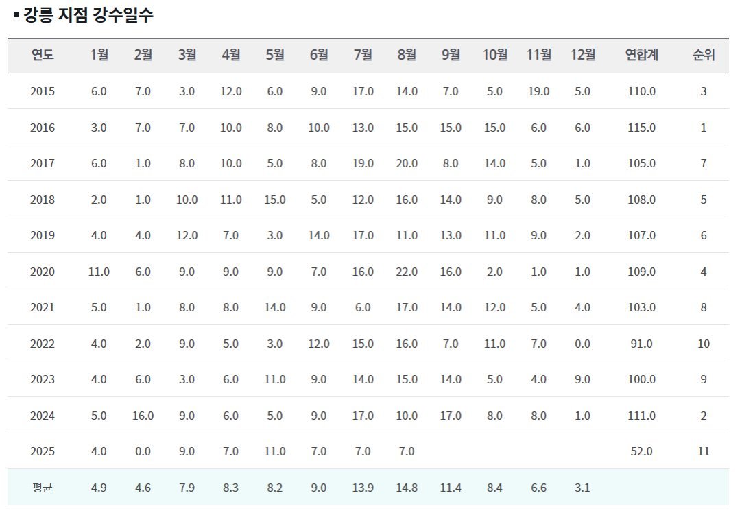 기상자료개발포털, '강릉지역 강수일수(10년, 2015-2025), 기상청, 2025년 8월 현재