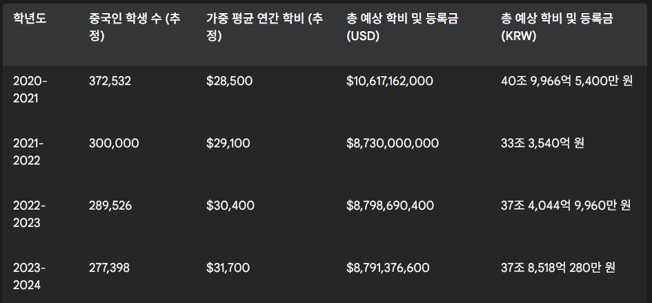 중국인 유학생의 감소 추세에도 불구하고, 2024년도에 미국(대학들)이 등록금과 학비만으로 중국인 유학생으로로부터 벌어들인 총 수익은 87억 9천만 달러이다. 한국 돈으로 환산하면 37조 8500억 원이다.