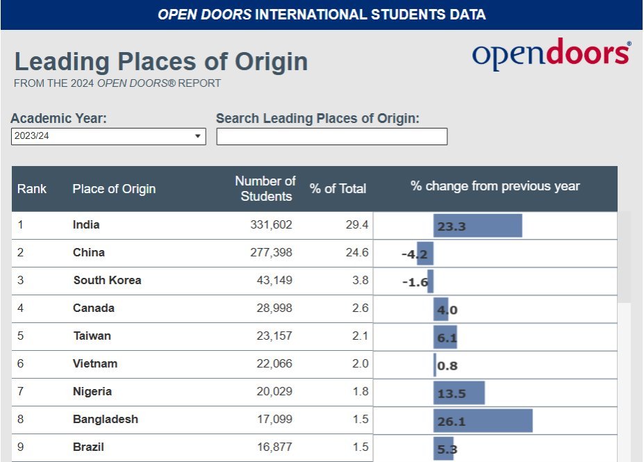 그러나, 2009년 이후 유학생 순위에서 늘 2위를 하던 인도(India)에서 유학온 학생들이 2024년에는 총 331,602명으로 집계되면서 그 동안 줄곧 1위를 차지했던 중국인 유학생(277,398명)을 처음으로 앞질렀다. 트럼프가 중국 학생들에게 우호적으로 바뀐 근본 원인은 이런 중국인 유학생의 현저한 감소 추세를 반영한 것이다.