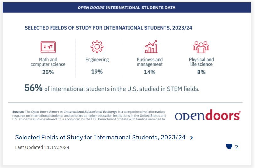 외국인 학생들은 주로 STEM(과학, 기술, 공학, 수학) 분야를 전공하고 있다. 미국에서 공부하는 중국 유학생들의 주요 전공과목은 수학과 컴퓨터 공학(25%), 엔지니어링(19%), 경영학(14%), 물리학과 생명공학(8%) 순으로 집계되고 있다. 이공계 전공이 전체 학과의 56%를 차지한다.