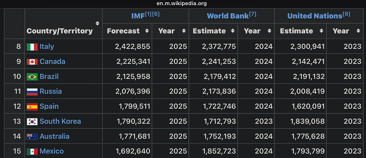 GDP 기준으로 한국의 2025년도 경제력은 세계 13위로 예측되고 있다. (Source: Wikipedia)