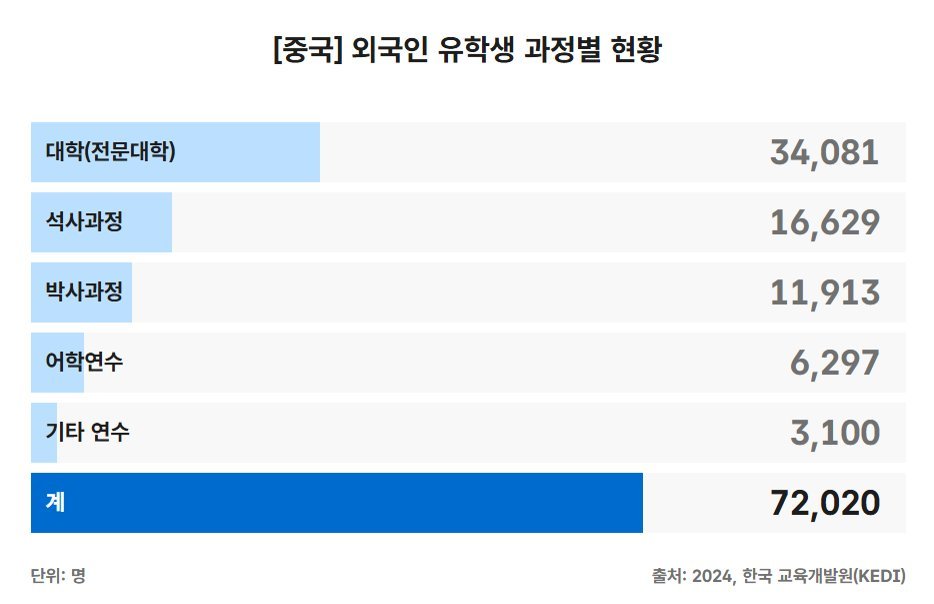 우선, 한국에 유학 온 전체 외국인 학생 수2024년 기준으로 208,962명으로 집계되었다. 이 중 한국에서 유학하고 있는 중국인 학생은 총 72,020명이다. 대학교에 재학하는 중국 학생이 34,081명으로 가장 많다. 석사과정은 16,629명, 박사과정은 11,913명으로 파악되고 있다.