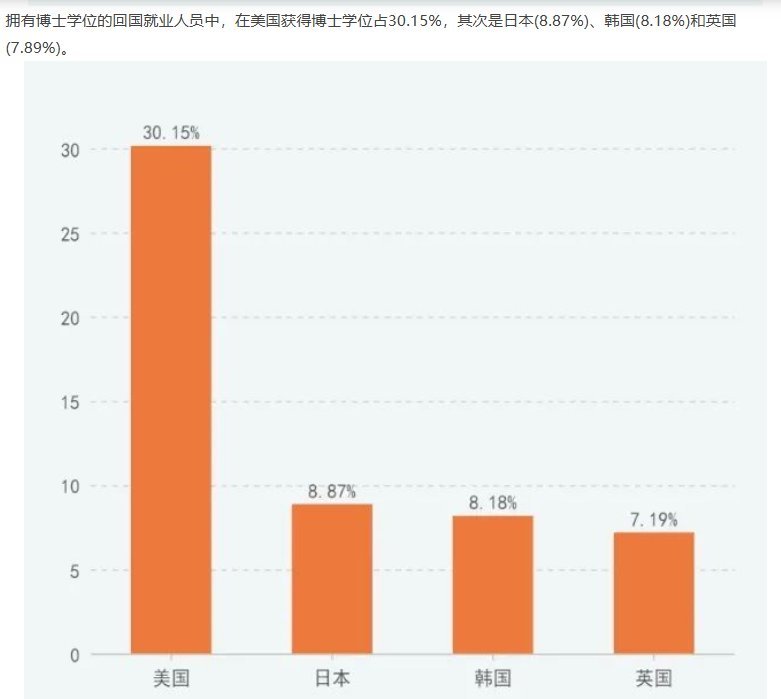 박사 학위 취득자들은 미국(30.15%)을 가장 선호했고, 일본(8.87%), 한국(8.18%), 영국(7.19%)이 뒤를 이었다. 이들 귀국 유학생의 절반 이상이 베이징에서 일하고 있으며, 취업처로는 국영 기업(49.94%)이 가장 많고, 공공 기관(31.33%)이 뒤를 이었다. 중앙(지방) 정부차원의 우수 인재 흡수 전략의 결과가 아닌가 한다.