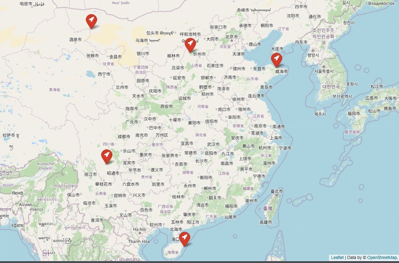 중국은 현재 고정식(지상) 대형 발사장 4개와 해상 바지선으로 이동하며 원하는 궤도로 올릴 수 있는 해상 이동식 발사체계 1개까지 총 5개의 인공위성 발사대를 갖추고 있다. (아래 표 & 지도 참조).
