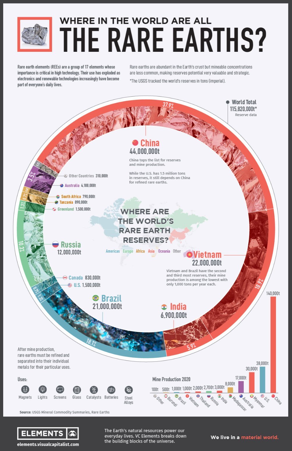 희토류 매장량 부문에서 Top 5 강국은 중국-베트남-브라질-러시아-인도 순이다. 희토류 생산량 부문 Top 5 국가는 중국-미국-미얀마-호주-마다가스카르-인도 순이다. 그래프가 보여주듯 '중국은 희토류 매장량, 생산량 양쪽 모두'에서 그 규모와 격차가 2위 국가와는 차원이 다르다.