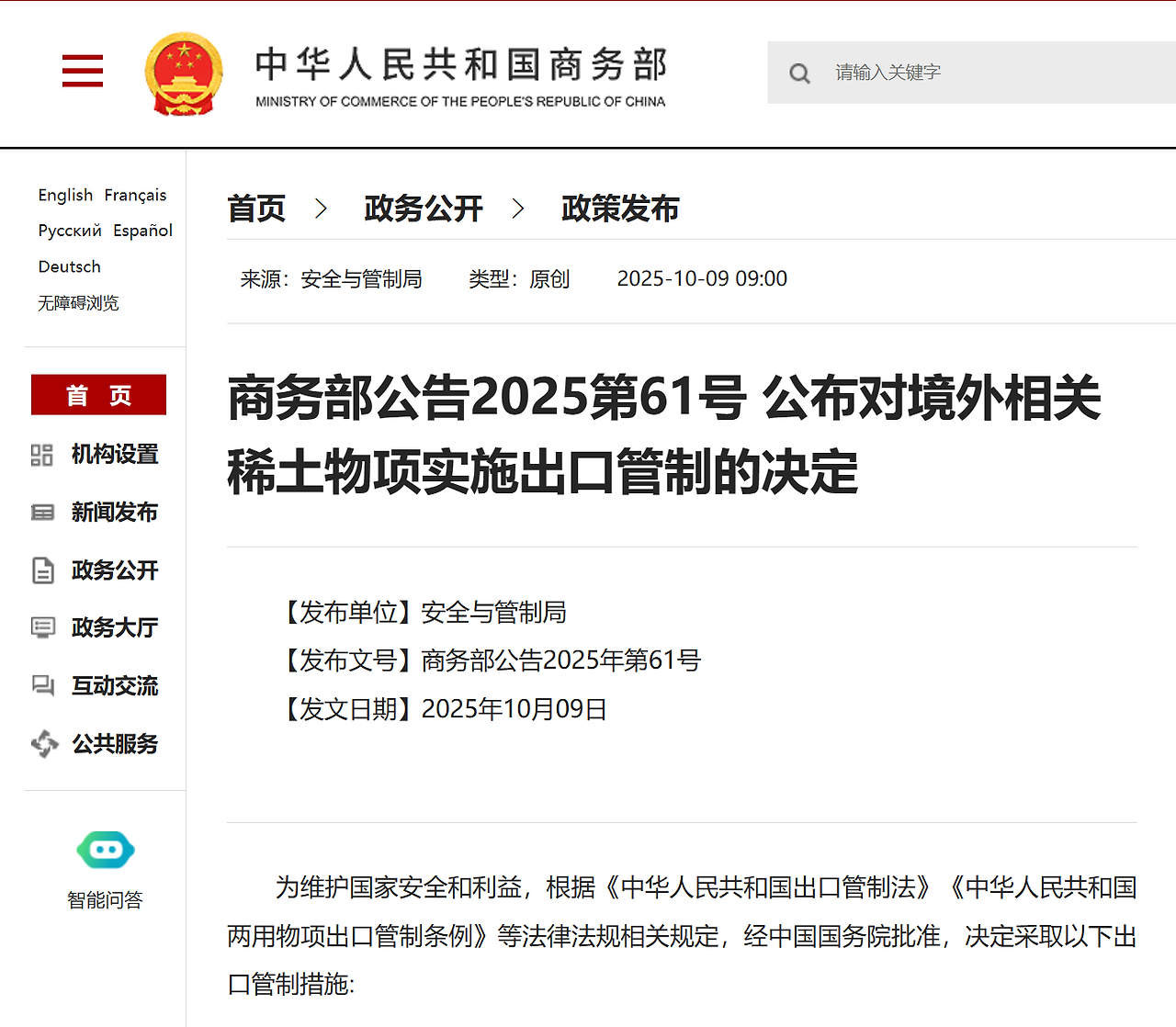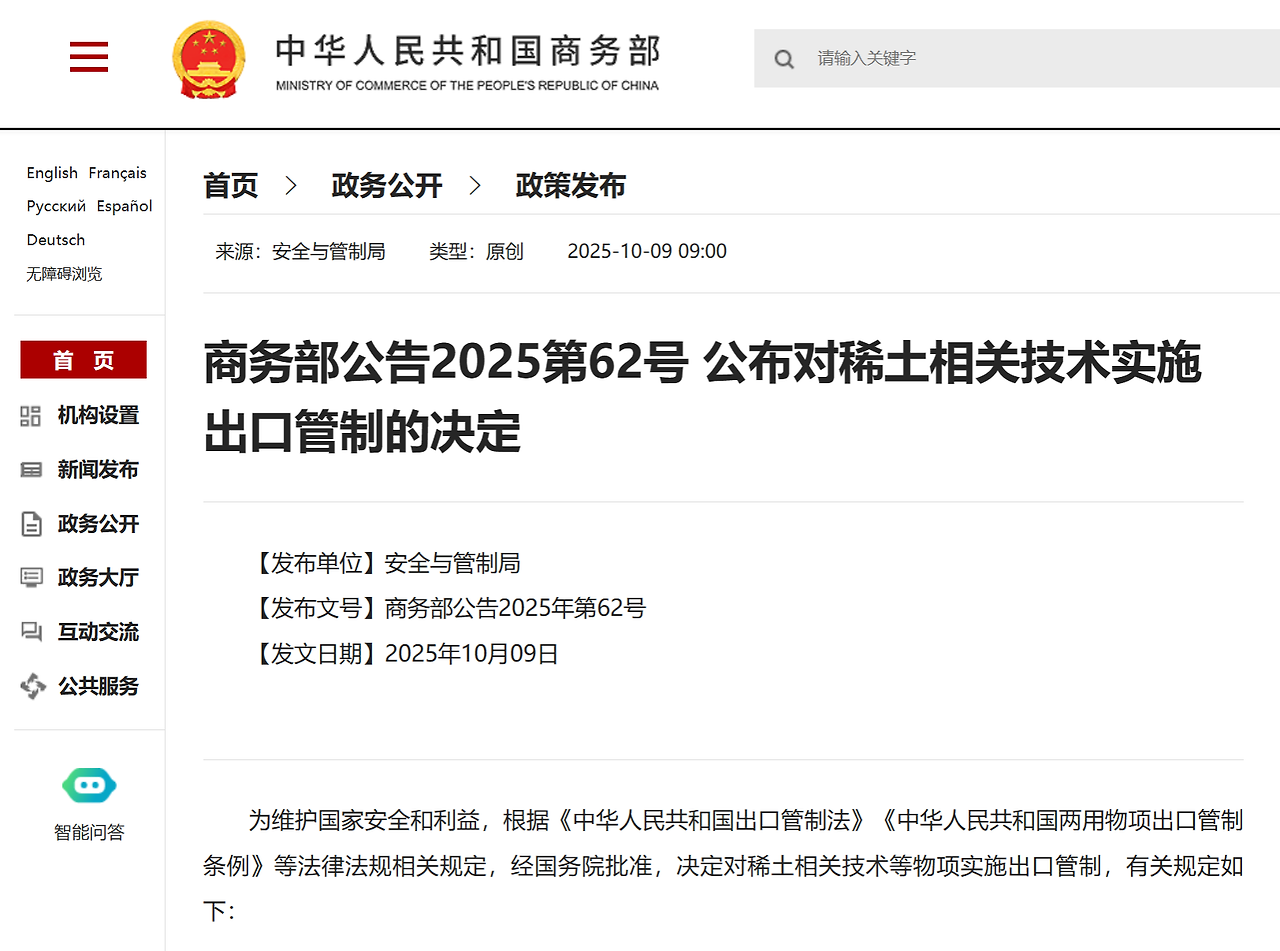 中华人民共和国商务部 (首页> 政务公开> 政策发布), "商务部公告2025第62号 公布对稀土相关技术实施出口管制的决定", 2025-10-09