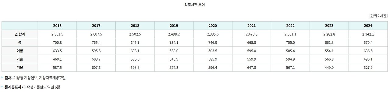 e-나라지표(통계청), "일조시간 추이>계절별 일조시간 변화 현황", 2025년 8월 현재