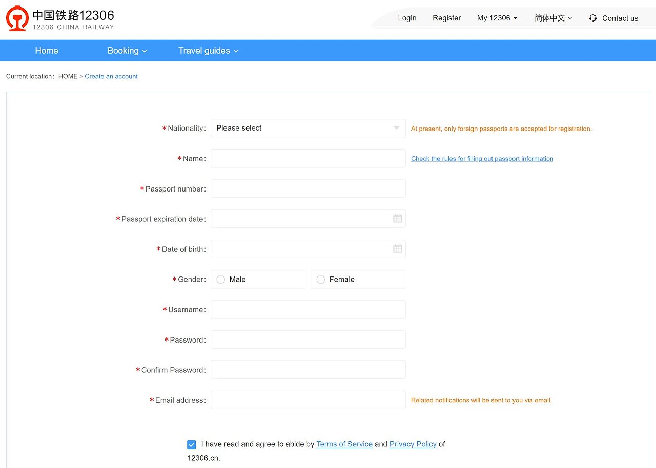 중국 현지 고속철도 예약을 위해서는 여권 정보 입력이 필요하다. (Image: 中国铁路 www.12306.cn 화면 갈무리)