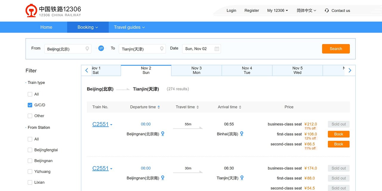 중국 국민들이면 모두가 사용한다는 '中国铁路12306' 예약 화면. 외국인을 위해 영어로도 서비스 중이다 (아래). (Image: 中国铁路12306 예약 화면 갈무리)