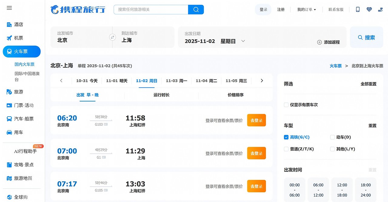 중국 최대의 온라인 여행 플랫폼 携程 (C 트립닷컴), 베이징-상하이 (하루 45회 운행) 고속열차 예약 화면 (Image: 携程 화면 갈무리)