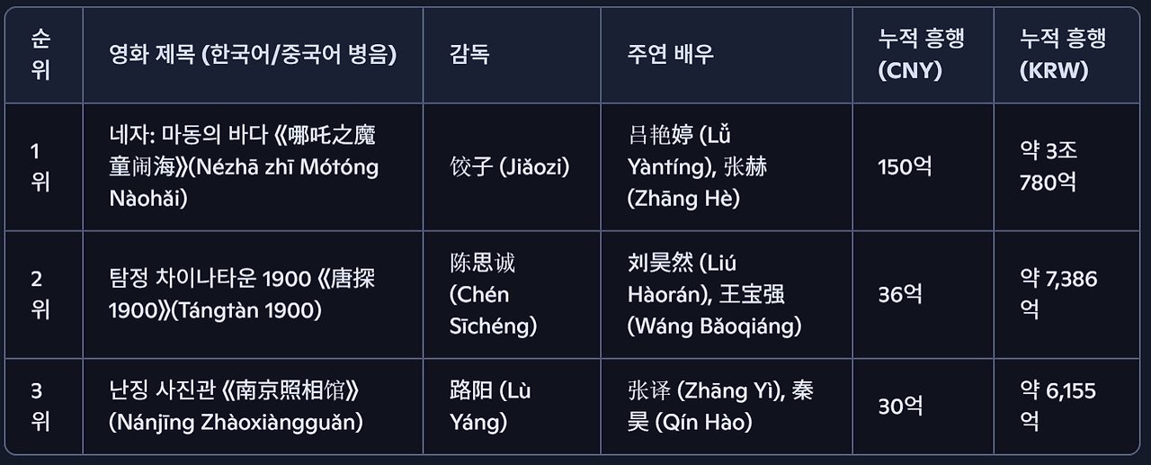 참고로, '주선율' 영화의 흐름을 반영하여 상업적으로도 성공한 2025년 11월 중국 박스오피스 최고의 매출을 올린 작품은 중국 애니메이션 영화의 자존심으로 헐리우드에서도 성공한 '너자(哪吒)'의 후속편인 《哪吒之魔童闹海》(네자: 마동의 바다, Nézhā zhī Mótóng Nàohǎi)가 있다. 누적 흥행 매출액 약 150억 위안(CNY, 약 3조 780억 원)을 달성하고 있다.
