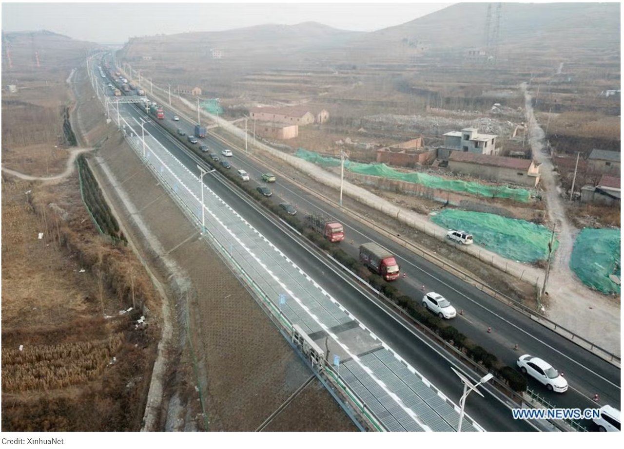 중국의 지역 고속도로에까지 태양광 패널이 설치되어 있다. (Image: News. cn 화면 갈무리)