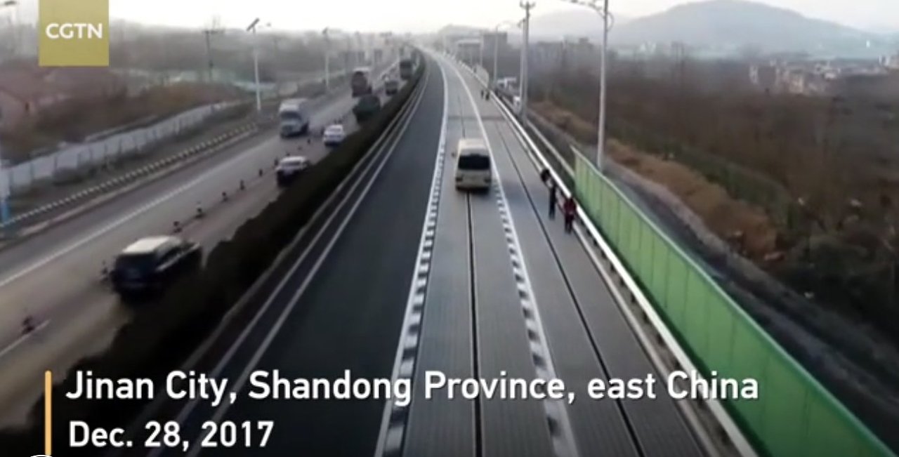 도로 옆이 아닌, 도로 표면에 태양광 패널을 구축한 새로운 공법을 중국이 개발했다. (Image: CGTN 화면 갈무리)