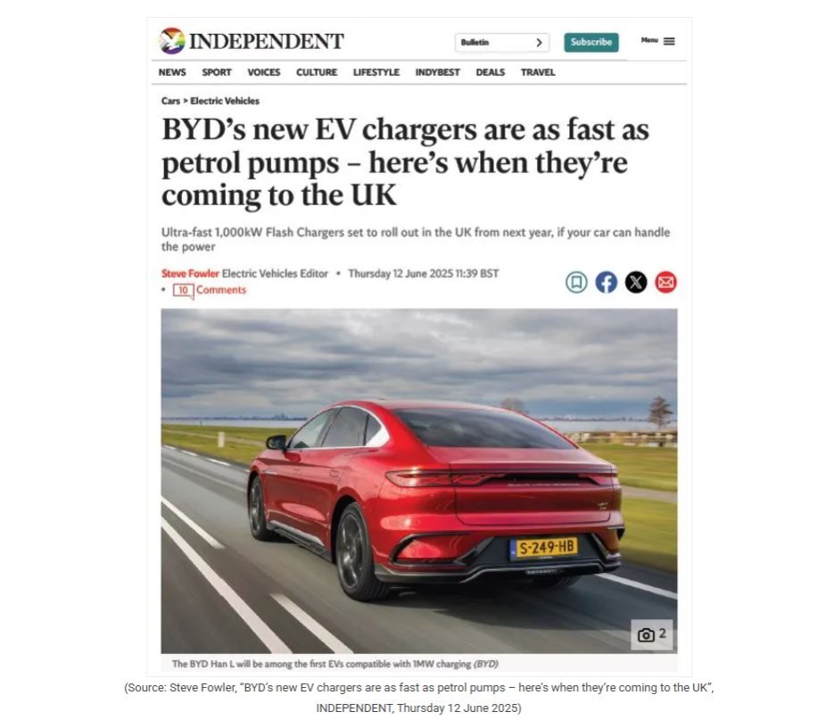 Steve Fowler, "BYD’s new EV chargers are as fast as petrol pumps – here’s when they’re coming to the UK", INDEPENDENT, Thursday 12 June 2025