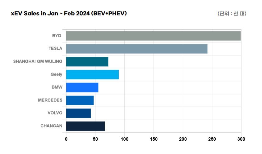 SNE Research, "2024년 1월-2월 업체별 전기 자동차 판매량",