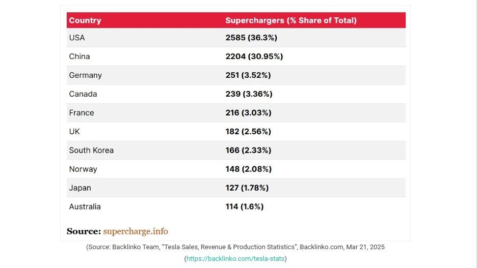 테슬라는 2025년 3월 기준으로 총 2,204개의 고속 충전소를 중국(China)에서 운영 중에 있으며, 이는 테슬라가 운영하는 글로벌 전체 고속 충전소의 30.95% (2위)를 차지한다.