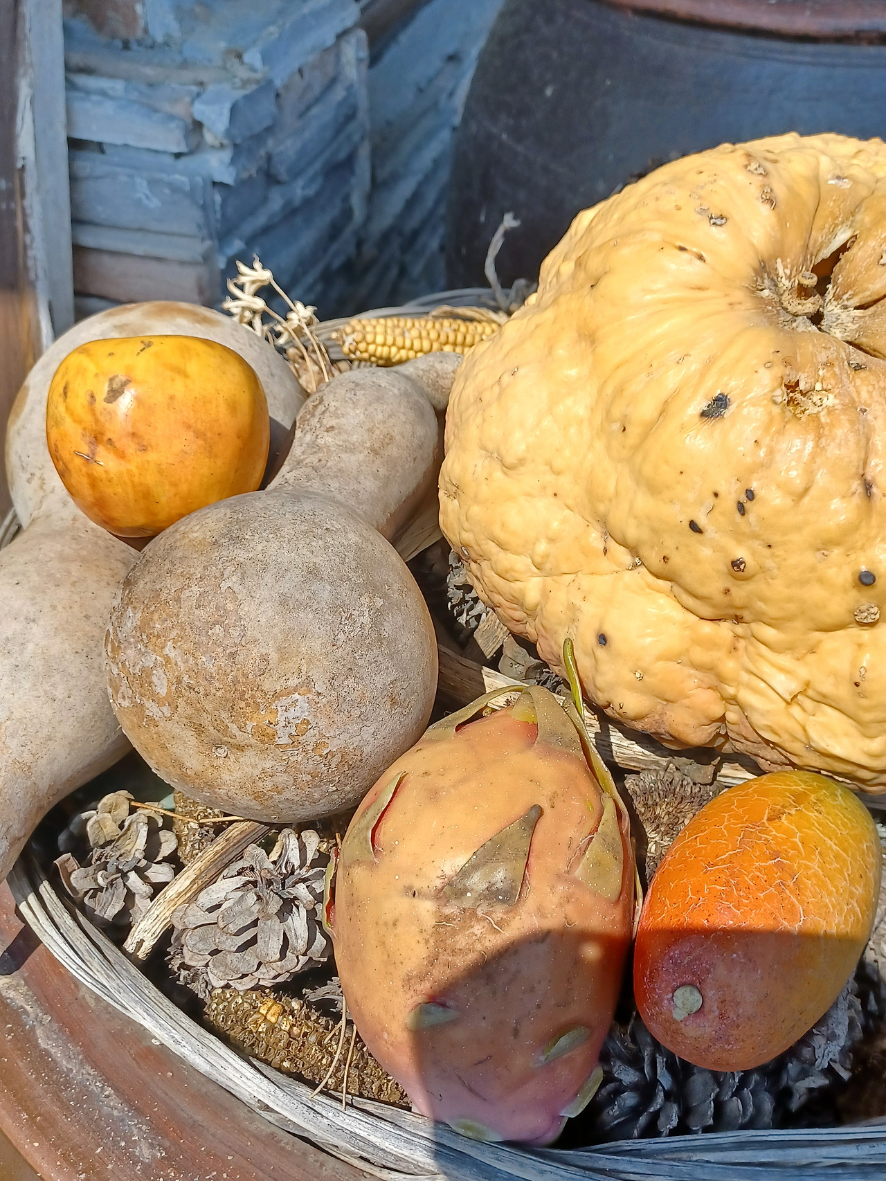 배고픈 티를 들키기 싫어 천천히 걷다가 일행 뒤로 슬쩍 빠진다. 오래된 한옥 건물, 흙담 따라 늘어선 뒤뜰이 깔끔하다. 쪽마루 귀퉁이 대광주리 안에 솔방울, 조롱박과 감자에다 옥수수까지 수북이 담겼다. 늦가을부터 비바람과 눈보라를 겨우내 받아내며 처마 아래 휑한 마룻바닥에 너부러져 시들고 찌들었을 것이다. 늙은 호박 껍질이 유독 울퉁불퉁하다. 선 굵은 주름이 깊게 파였다. 우리 엄마 얼굴처럼.