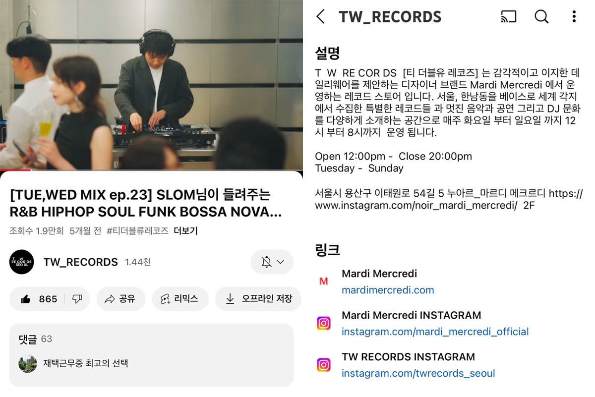 사실 저는 슬롬 님 팬이라 음악을 듣고 싶어 들어간 건데, 마르디 메크르디에서 레코드 스토어까지 운영하는 줄은 몰랐어요. 그런데 막상 보니, 패션과 음악—특히 DJ씬은 떼어놓을 수 없는 브랜드 컬쳐의 중요한 요소라는 걸 다시 느끼게 되더군요. 생각해 보면 키츠네 메종 역시 DJ 컬쳐를 기반으로 성장한 브랜드였죠. 결국 브랜드가 가진 세계관을 가장 감각적으로 보여줄 수 있는 게 바로 이런 컬쳐적 접점이에요.