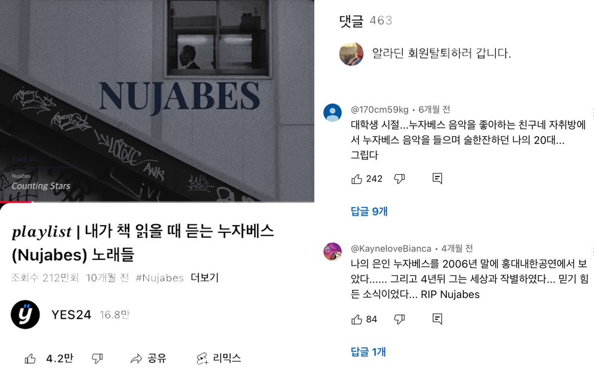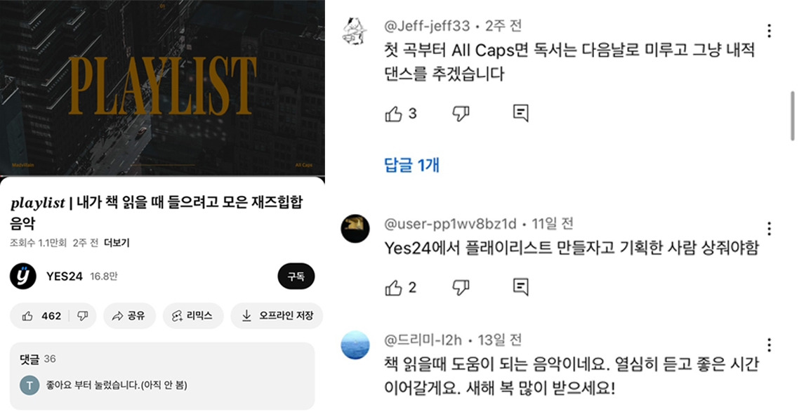 Yes 24는 책을 판매하는 플랫폼이지만, 단순히 '책' 그 자체가 아니라 책을 읽는 상황에 포커스를 두고 콘텐츠를 만들었어요. 대표적인 예가 '책 읽을 때 듣기 좋은 플레이리스트'죠. 댓글 반응만 봐도 소비자들의 내적 친밀감이 얼마나 높아지는지 알 수 있어요. "알라딘 회원 탈퇴하러 간다"는 댓글까지 있을 정도니까요. 제가 만약 Yes24 마케터였음 이 댓글 다신 분한테 사랑한다 고백할 것 같아요. (ㅎㅎ)