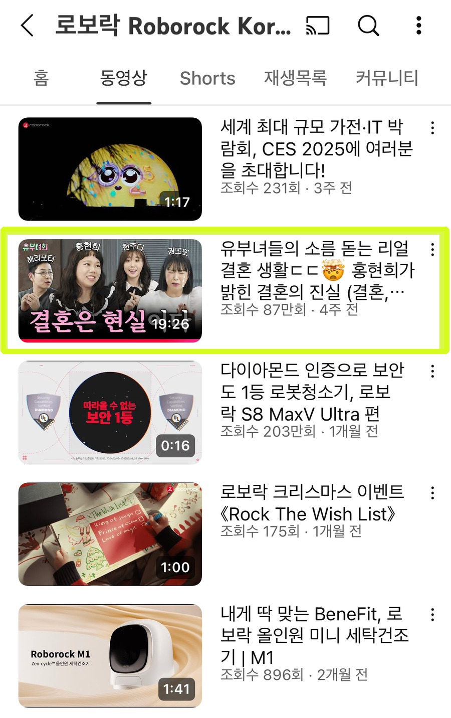 재미있는 건, 로보락이 이전에 올린 단순 제품 홍보 영상들은 조회수가 수백~수천 단위에 머물렀던 반면, 이번 토크 콘텐츠는 87만 회라는 압도적인 반응을 얻었다는 점이에요. 로보락은 토크 예능이라는 형식을 통해 편한 친구와 수다를 떨 듯, 친근하고 가까운 관계를 제대로 구축했어요.