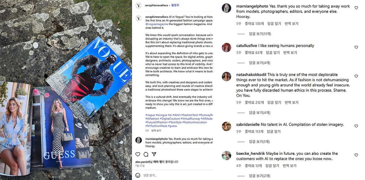 최근 공개 된 게스 GUESS의 캠페인입니다. 여러분이 보시기에 어떤가요, 아름답게 느껴지시나요? 윤기 나는 금발, 글래머러스한 몸매 등 너무도 이상화된 '미국식 미인상'을 그대로 구현한 이 모델은 사실 AI로 생성된 인물입니다. 지난 8월호 보그 VOGUE 매거진에 실린 직후, 반응은 뜨겁다 못해 논란으로 번졌습니다.