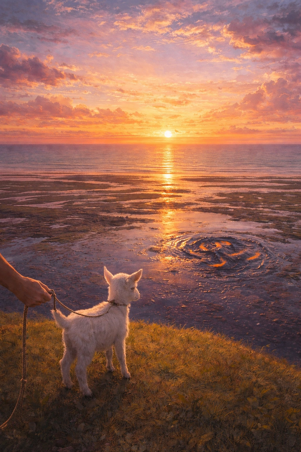 언덕 위에서 아기염소와 함께 내려다보는 노을, 수평선,