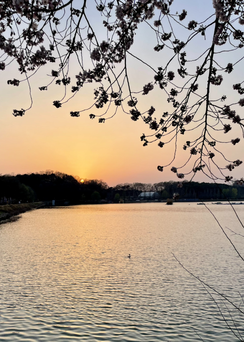 노을이 가득한 하늘과 호수를 비추는 석양.