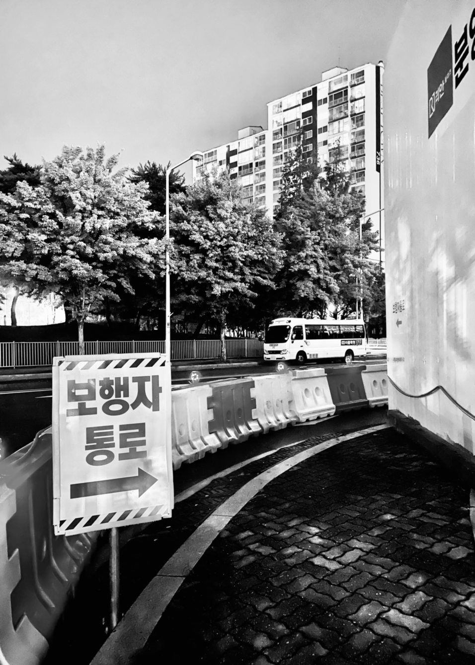 펜스와 안내판으로 보행자들의 안전을 확보하고 불편을 최소화하려는 노력이 보인다.