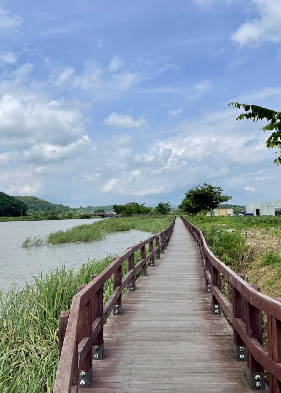 저수지 옆을 걷을 수 있는 나무 테크가 너무 반갑다.