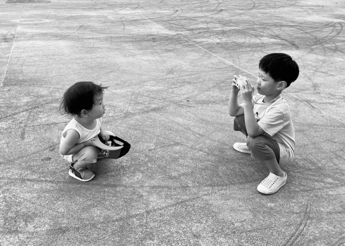선물 받은 카메라로 동생을 찍어주겠다고 한다.