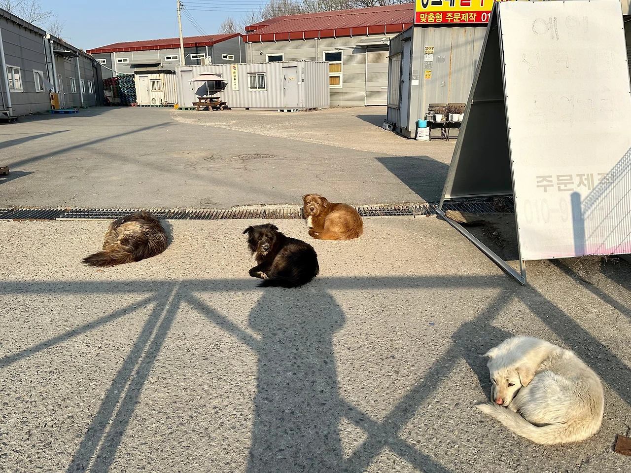 닫힌 철문 뒤로 덩치가 큰 개 네 마리가 와서 자리를 잡는다.