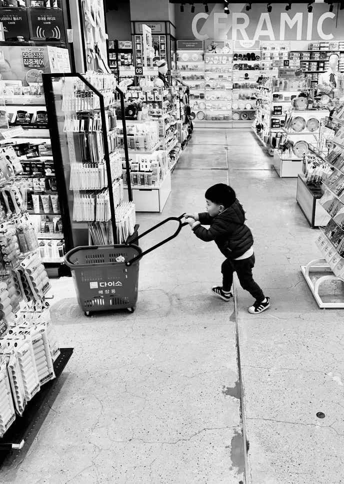 종횡무진 바구니를 밀고 다니는 아들.