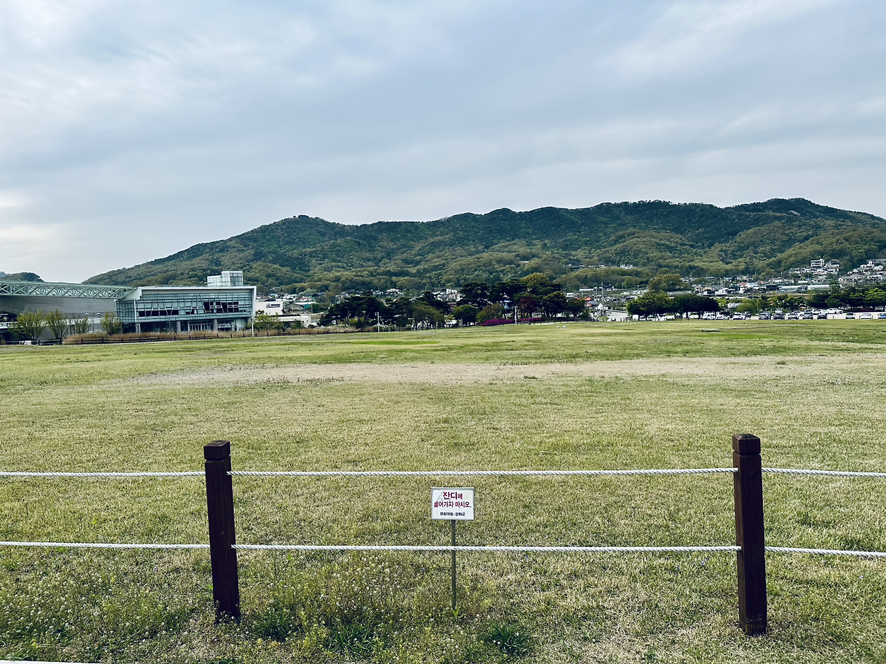 드넓은 잔디밭 가운데 덩그러니 놓여있는 고인돌과