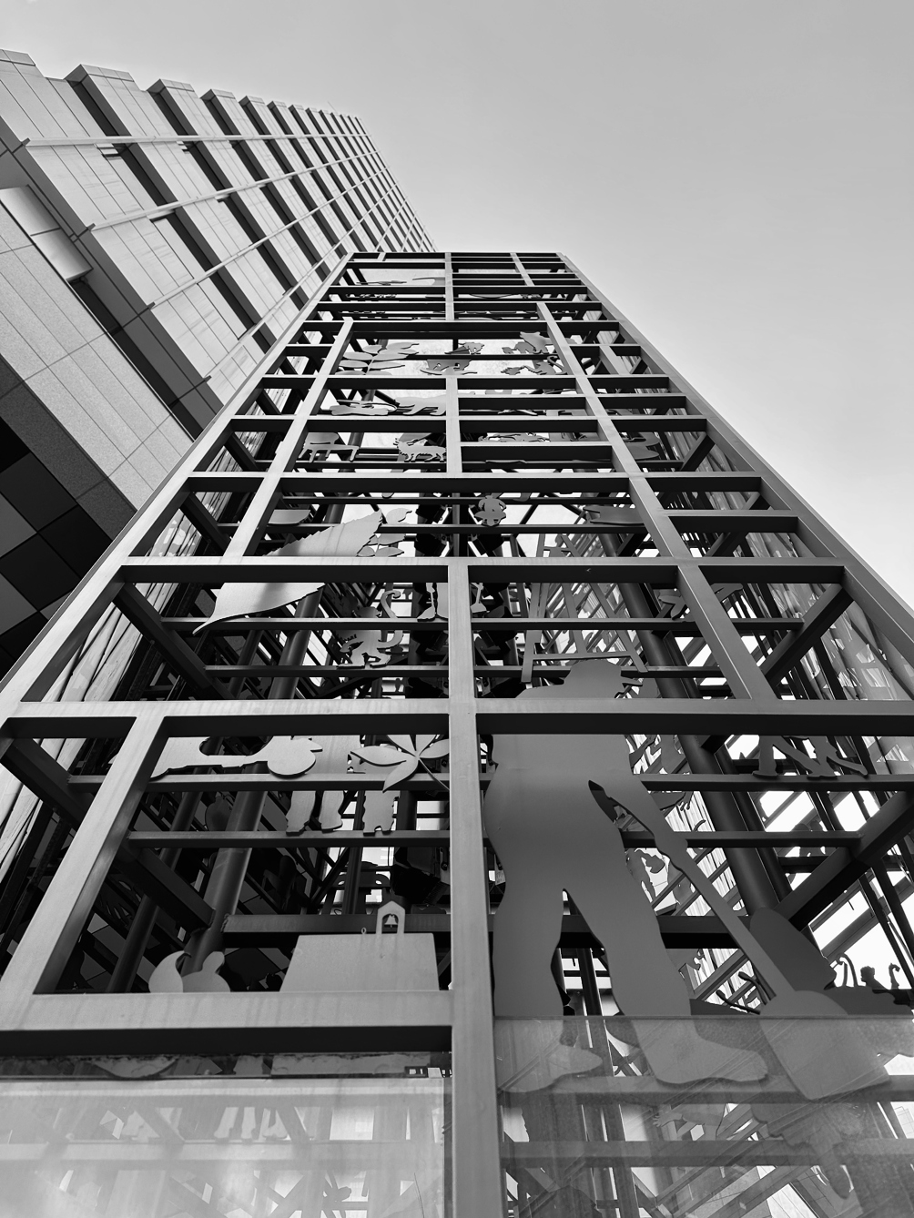 많은 사람들이 지나가는 자리에 우뚝 솟아 있는 설치미술 작품.