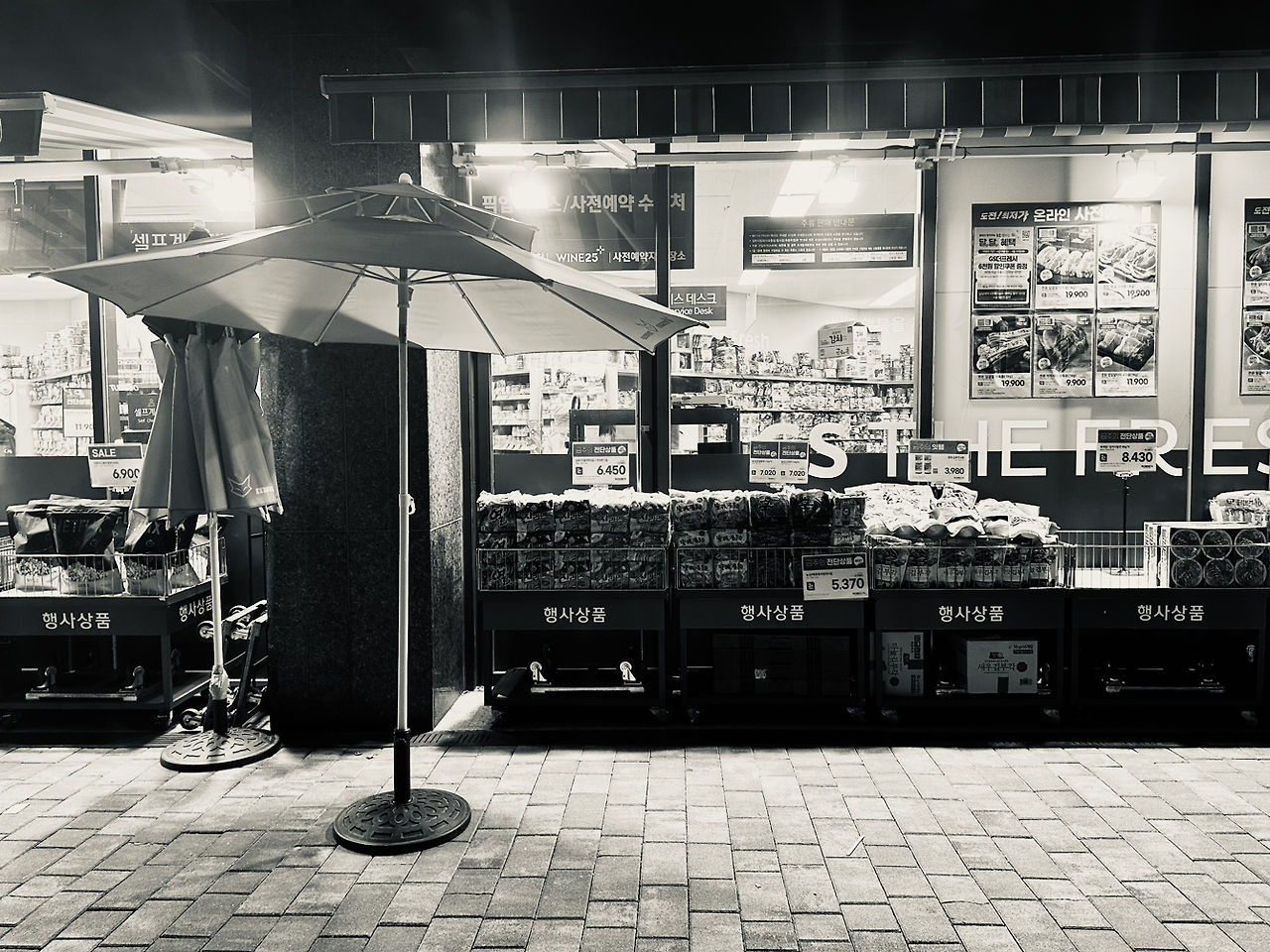 해가 지고 상점의 불빛만이 빛나는 시간에