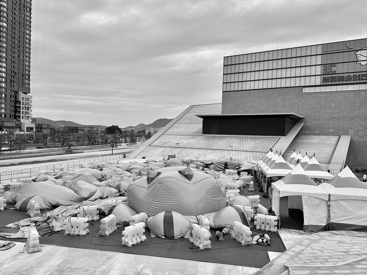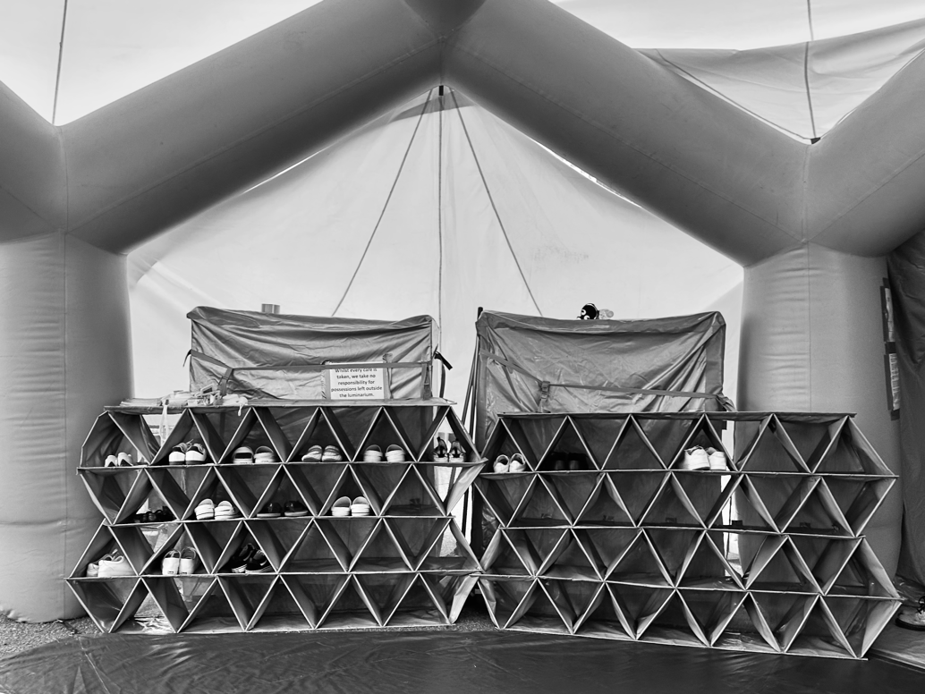 신발장에 빈 곳이 없으면 실내 전시 공간에 사람들이 가득 차 있다는 뜻이다.