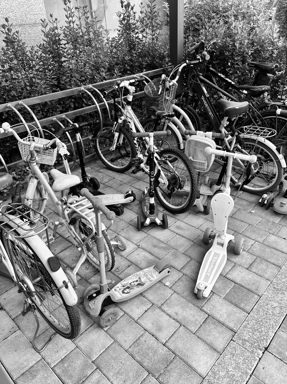 어린이집 바로 옆에 자리 잡고 있는 자전거 보관소에는 킥보드 또한 많다.