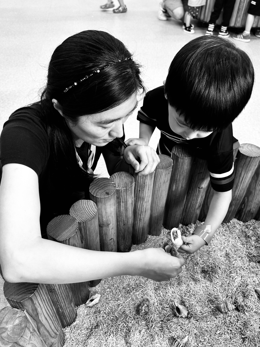 엄마와 함께 소라 속에 있는 게를 관찰.