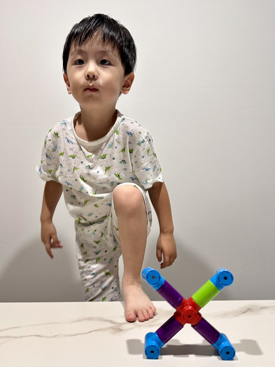 자석 블록을 이리저리 맞추어 보는데 우연히 X자 모양이 되었다.