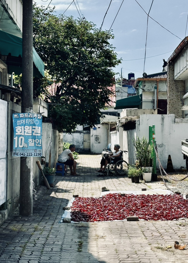 골목을 지나가려면 마르고 있는 고추도 피해야 하지만 두 분의 대화도 잠시 끊어야만 한다.