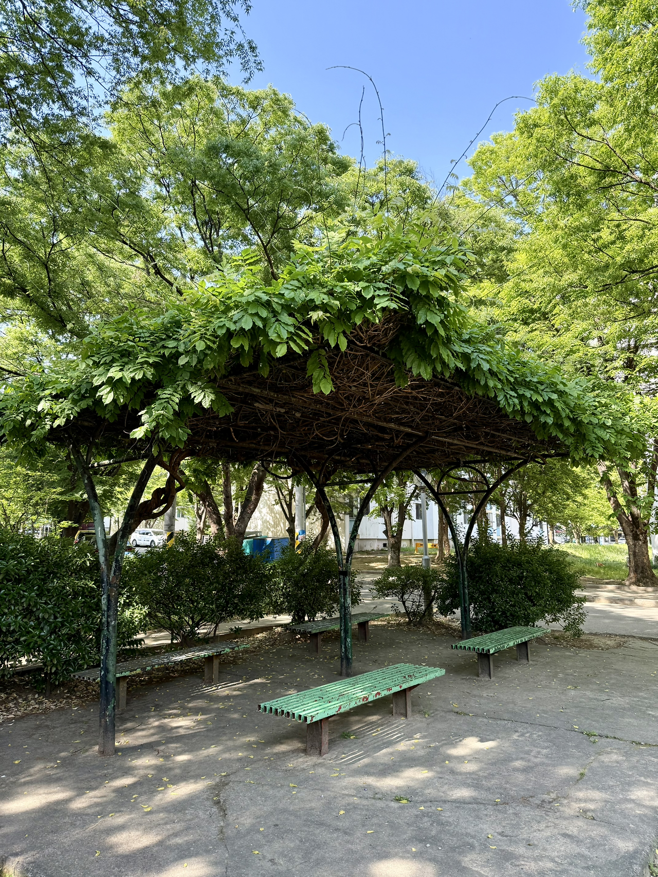 등나무를 이용한 지붕에 낡은 벤치.