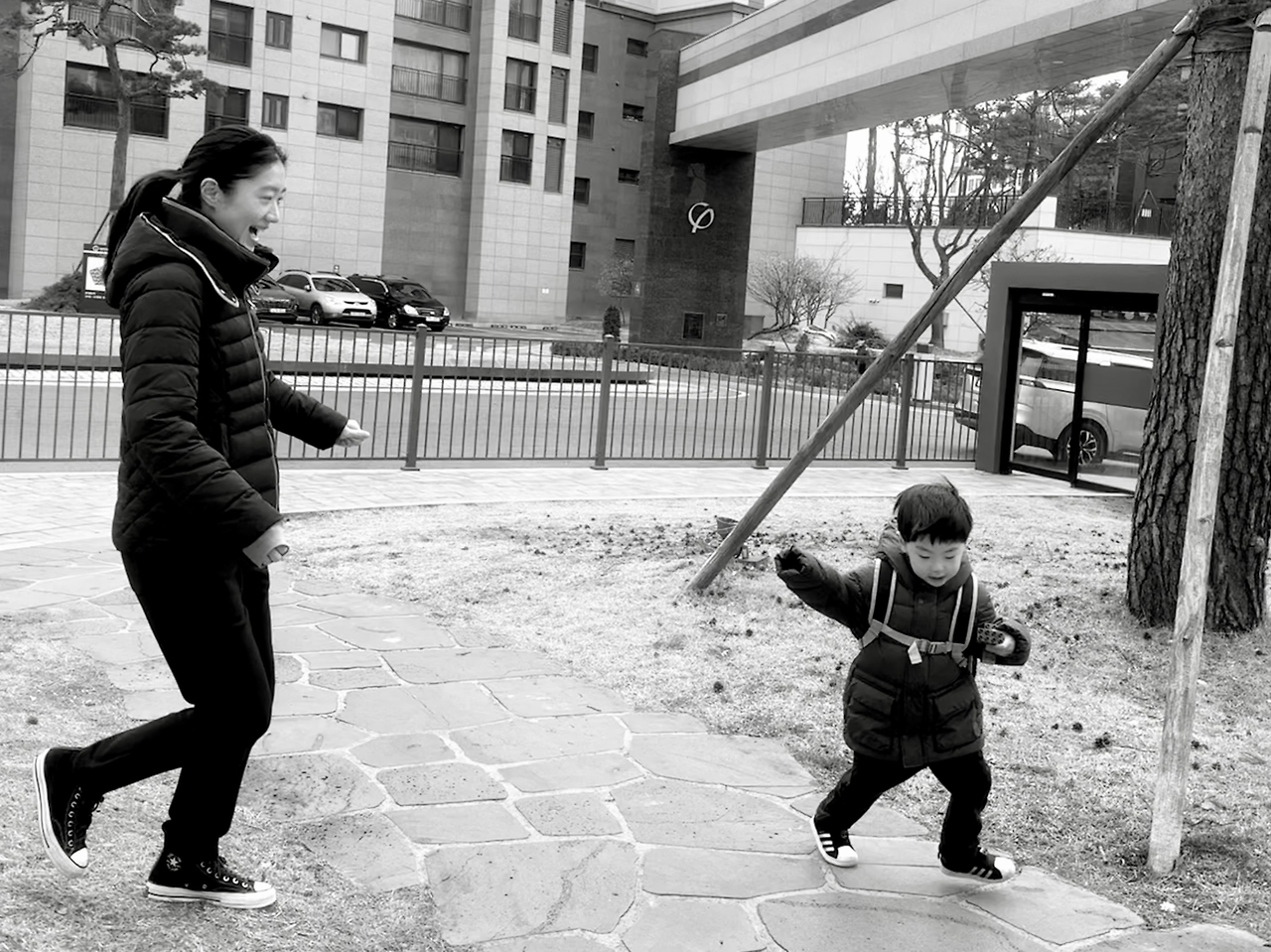 스쿨버스를 기다리는 짧은 시간 동안에 즐기는 술래잡기.