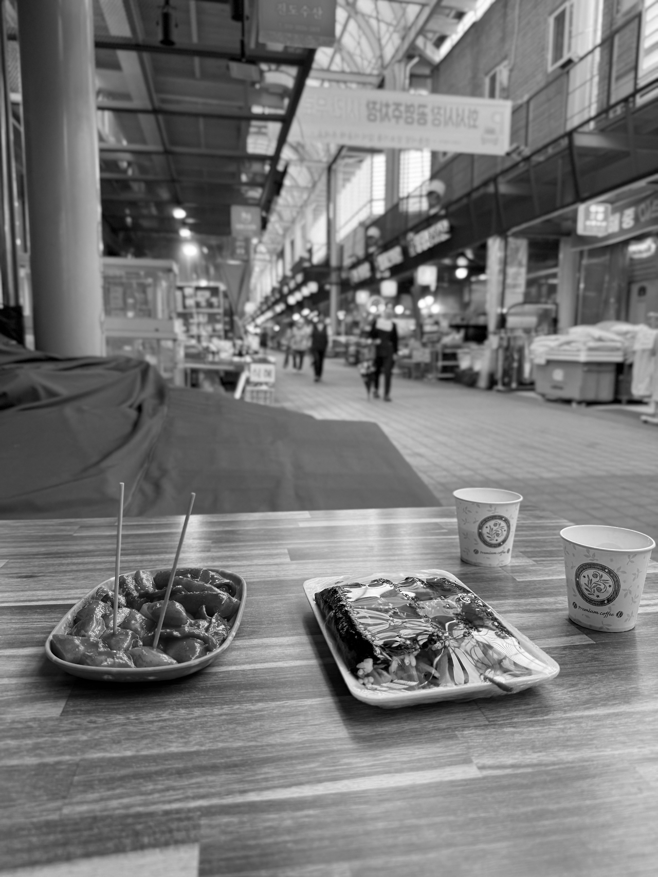 시장에서 떡볶이와 순대로 점심을 먹는 것으로