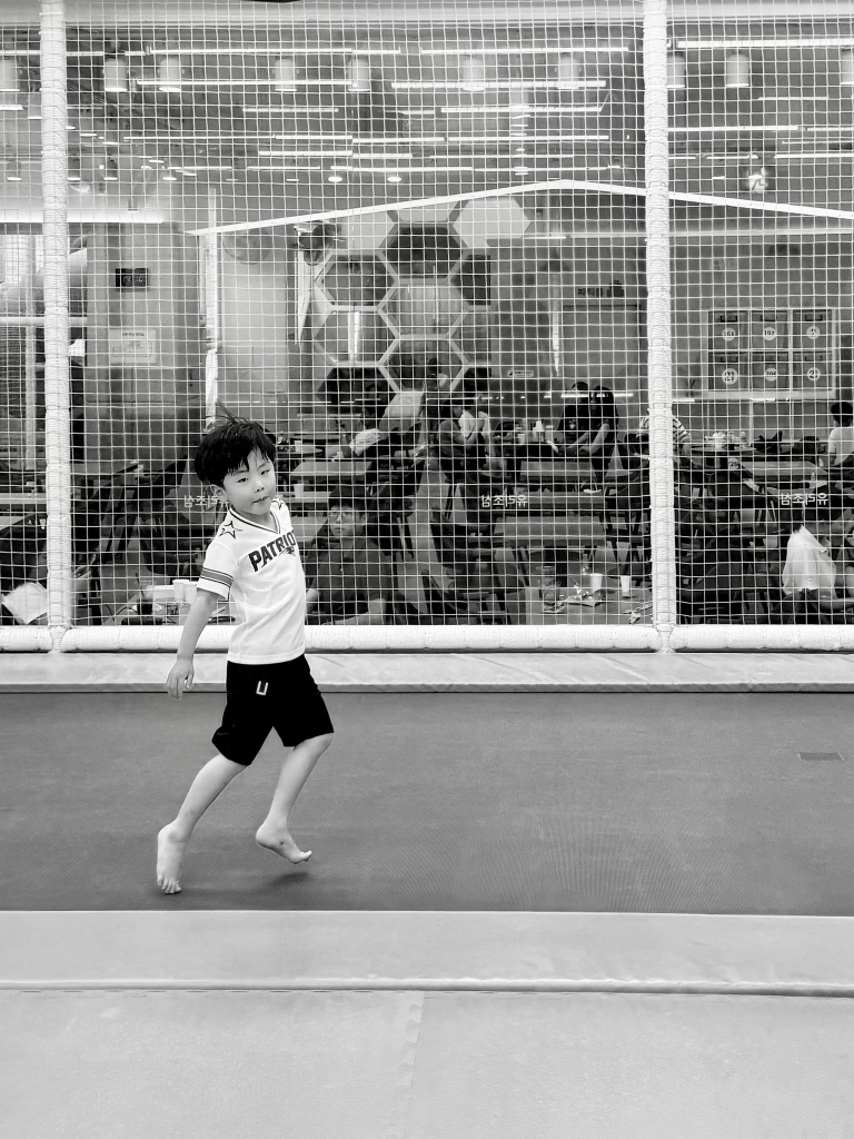 자리 잡고, 커피 한 잔 가져오는 아빠 옆을 쏜살같이 지나친다.