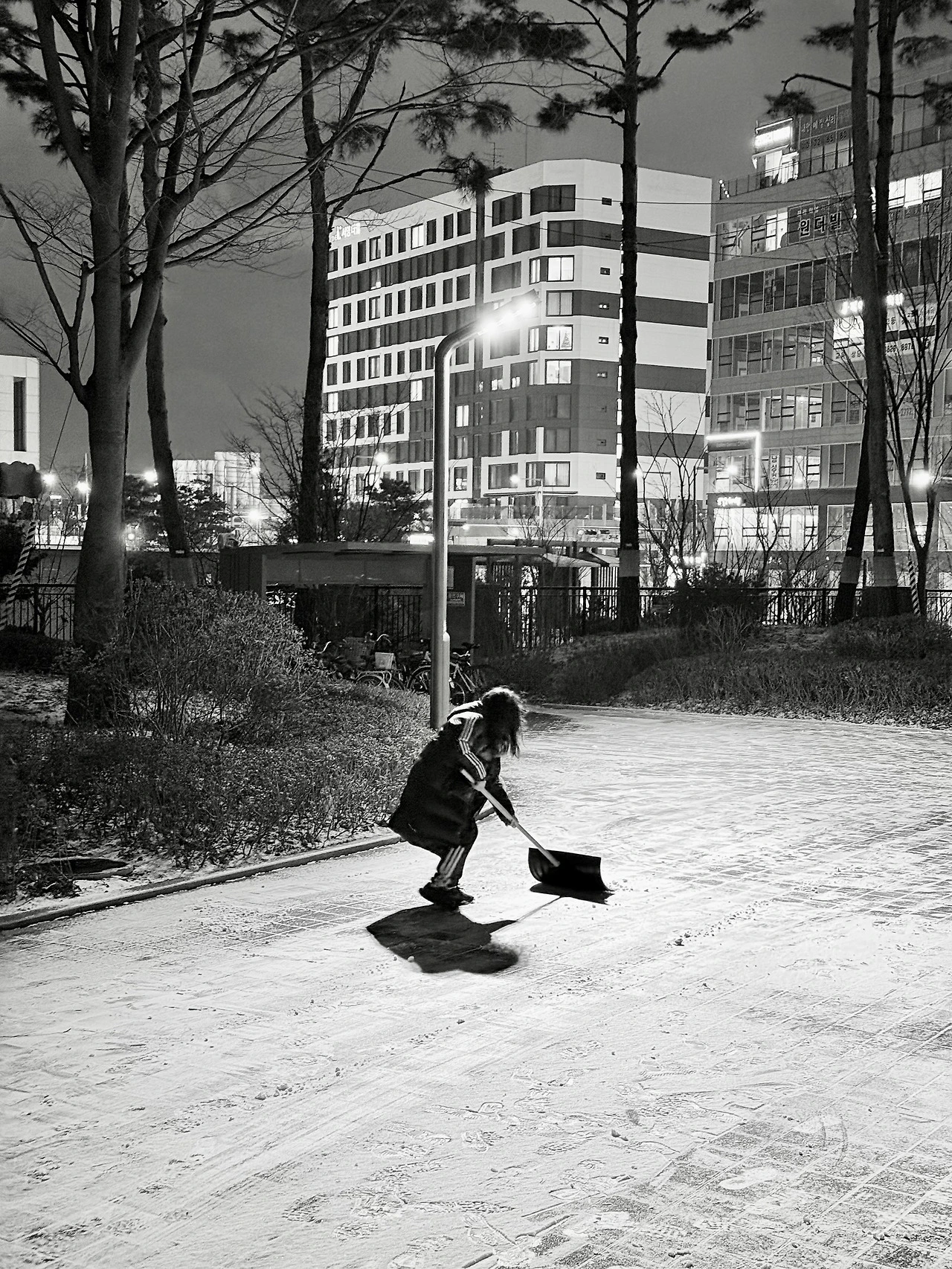 신바람 나게 눈을 쓸어 치우니 일석이조.