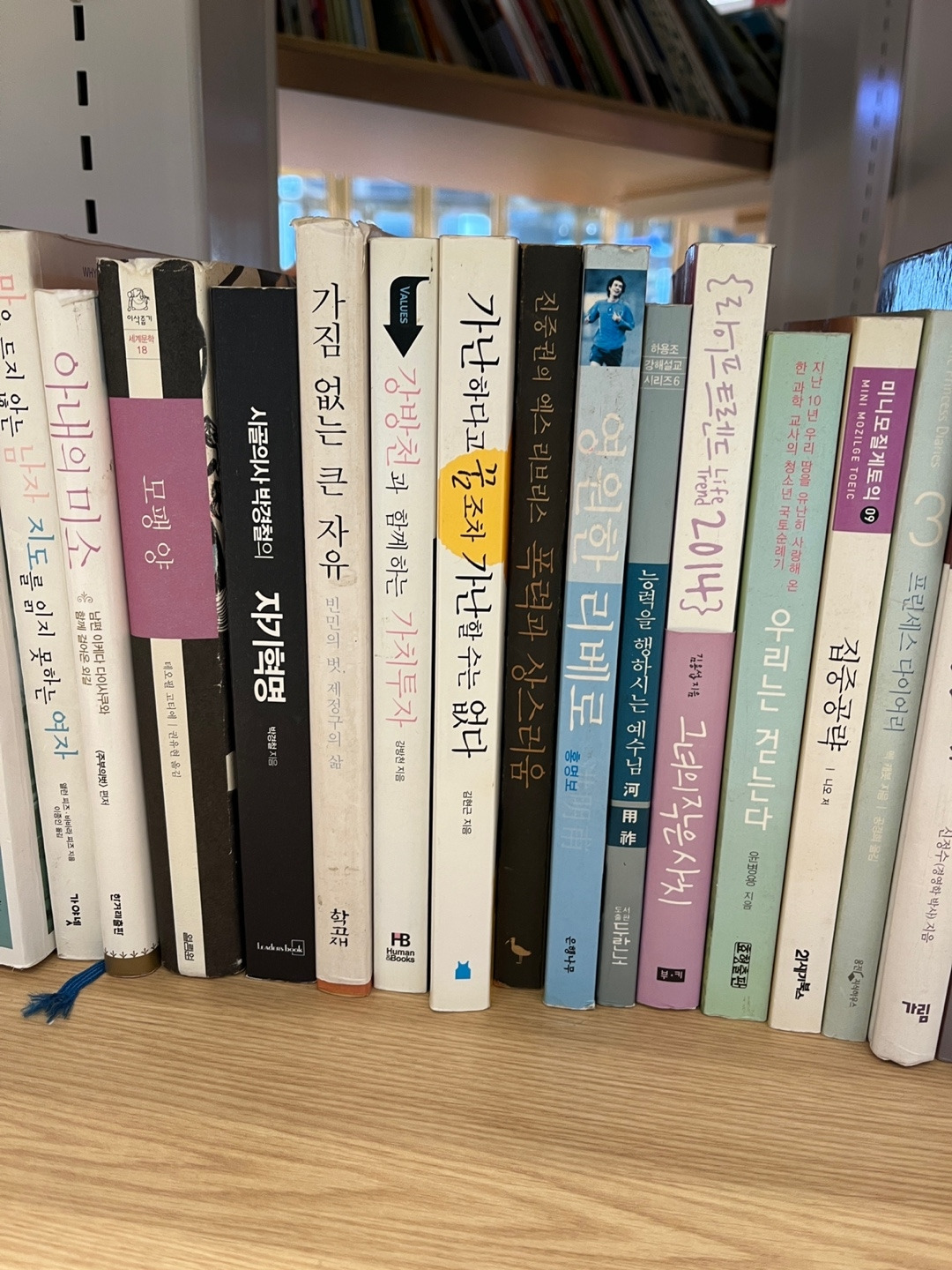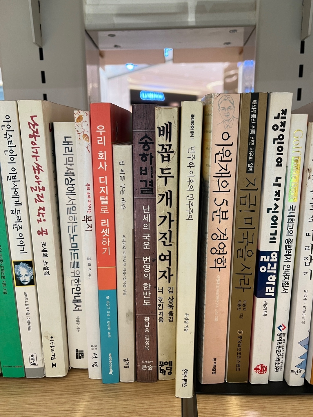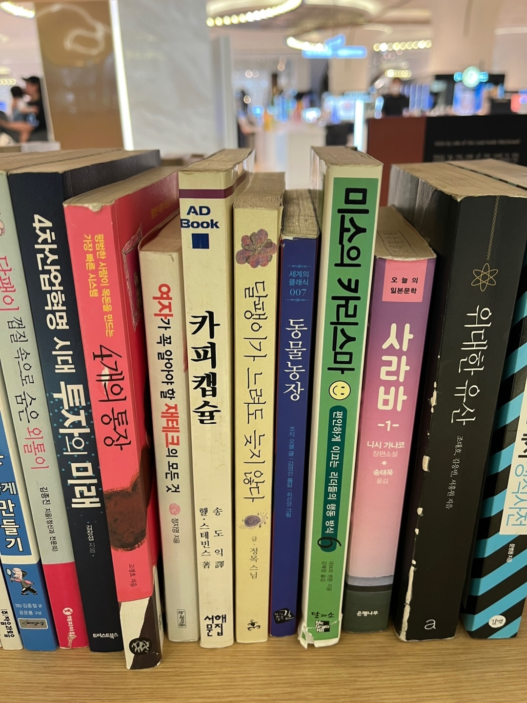 이곳은 마치 별마당 도서관의 축소 버전이다. 잠시 자리를 잡고 원 한 바퀴를 둘러본다. 둘러보며, 눈에 들어오는 책 제목을 살핀다. 수백 가지의 책 제목들이 자기를 봐달라며 손짓하지만 그중에 눈에 들어온 제목들이 아래에 있다. 아무것도 아닌 것 같이 넘길 수 있으나 어떠한 제목이 나의 시선을 사로잡았는지에 대한 느낌을 고스란히 기억하고 나중에 활용해 보고자 생각한다.