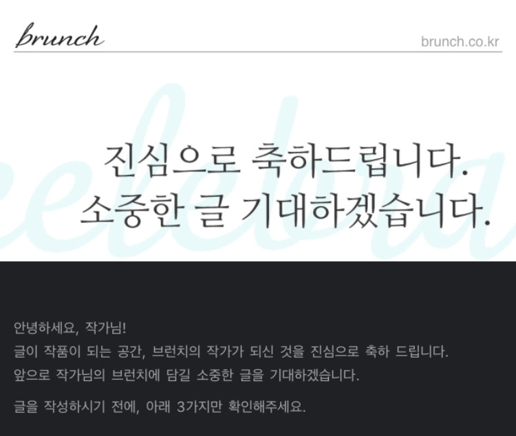 브런치로부터 한 통의 이메일을 받았다. 브런치에 작가가 됐다는 이메일이었다. 브런치에서 작가가 된다는 것이 그렇게 축하받을 일인가라는 생각이 잠시 들었다가 ‘작가’라는 어감이 그다지 나쁘지 않다는 생각이 들었다.