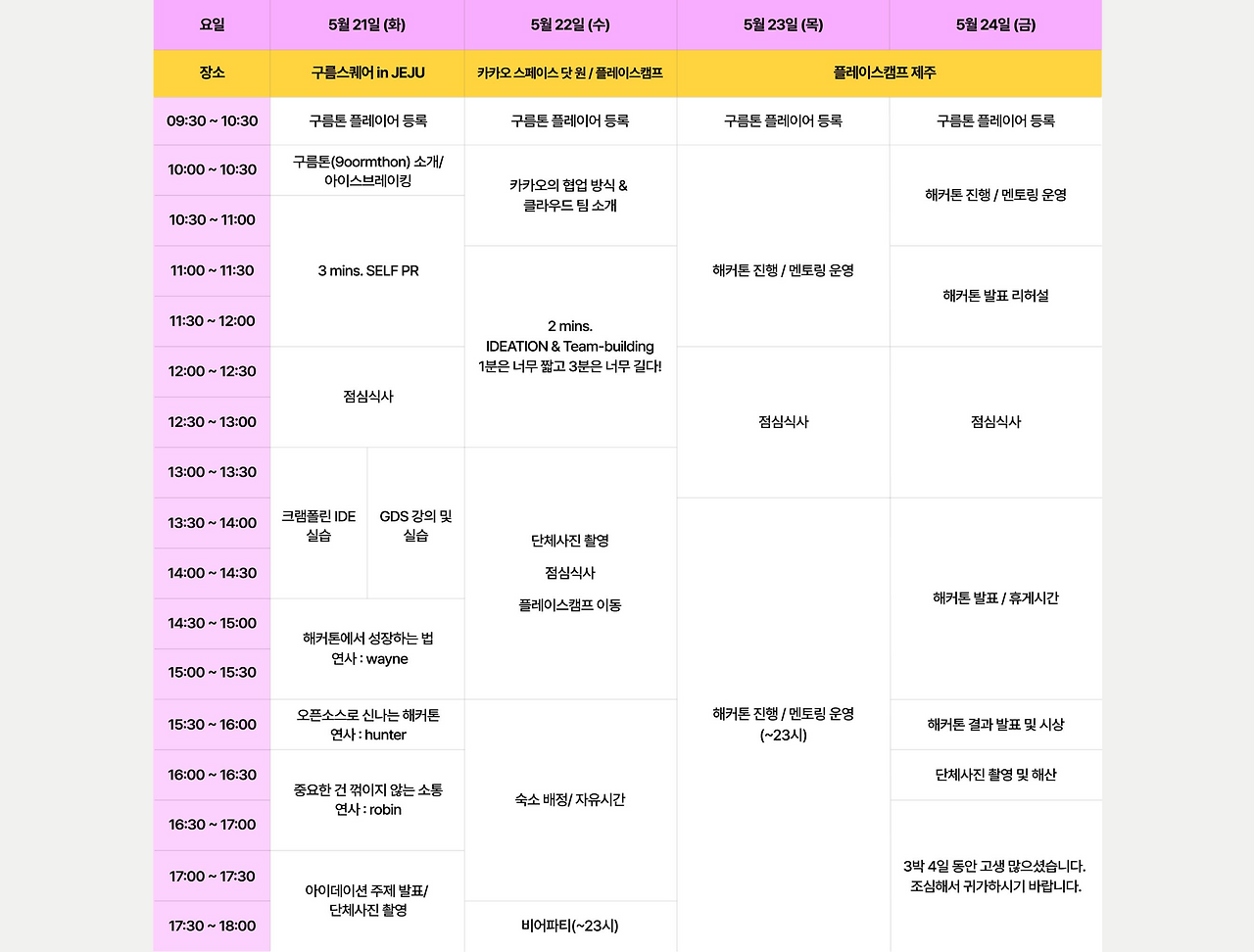 구름톤 in JEJU는 카카오와 구름이 주최하는 해커톤인데, 제주도에서 3박 4일 동안 교육과 강연, 해커톤까지 진행된다. 구름톤 후기를 찾아보니 교육 프로그램도 궁금했고, 첫 해커톤. 제주에서 경험해 보면 더 재밌겠단 생각으로 지원을 결심했다.