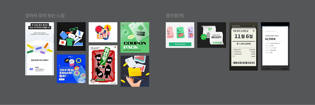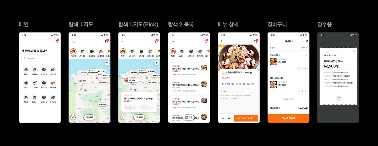 가제가 '제주 장바구니'인 만큼 영수증을 컨셉으로 했다. 담은 메뉴를 마지막에 영수증으로 보여주면서, 여러 메뉴를 장바구니에 담는 느낌으로 시각적으로도 재미있게 표현할 수 있을 요소라고 생각했다.