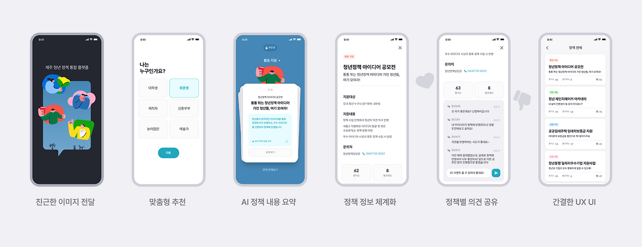 시간이 얼마 남지 않았으니 더 신중하게 주제를 선정했다. 다행히도 우리에겐 후보였던 좋은 아이디어들이 있었는데, 그중에서 제주의 청년 인구 감소로 인한 다양한 문제를 해결하기 위해서 청년이 제주에 정착할 수 있도록 도와주는 서비스를 만들기로 했다. 그 방법으로 우리는 제주의 청년 정책을 모아서 맞춤형으로 제공하고, 정책 의견을 공유할 수 있는 플랫폼을 기획했다.